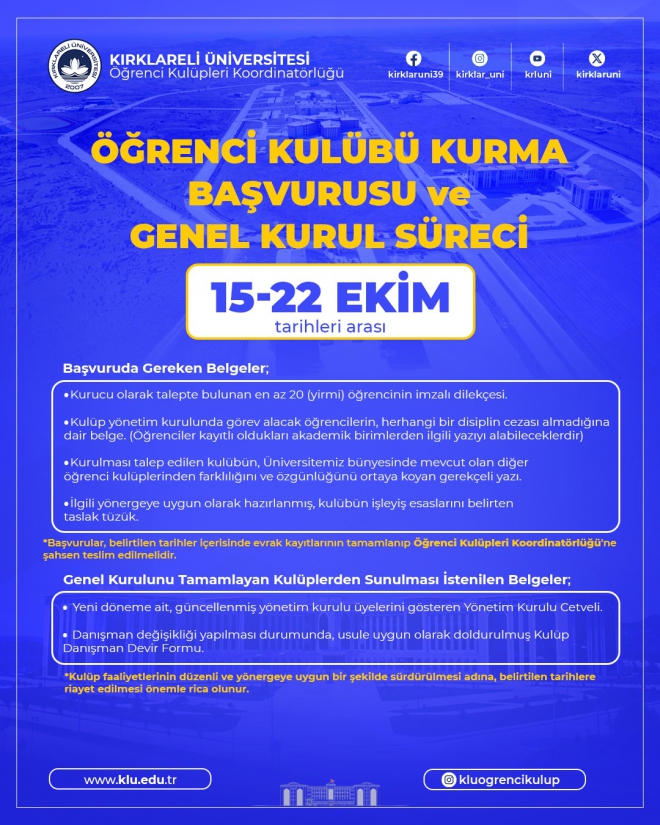 Kırklareli Üniversitesi Öğrenci Kulüpleri ve Öğrenci Kulüpleri Koordinatörlüğü Yönergesi gereğince, genel kurul evraklarının teslim süreci 15 Ekim 2025 tarihinde başlayacak olup, son teslim tarihi 22 Ekim 2025 Çarşamba günü mesai bitimidir.